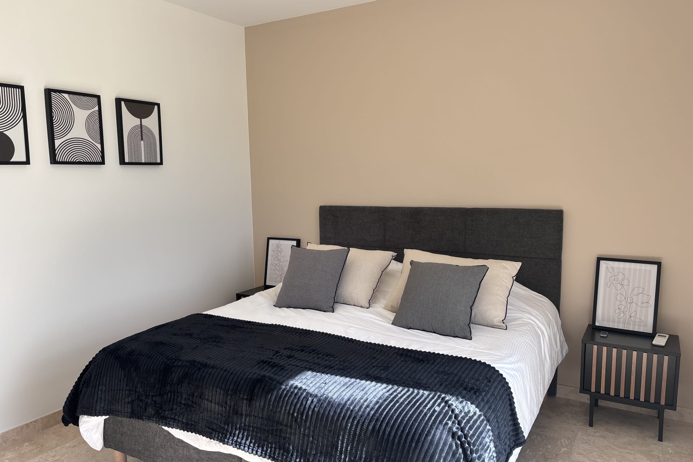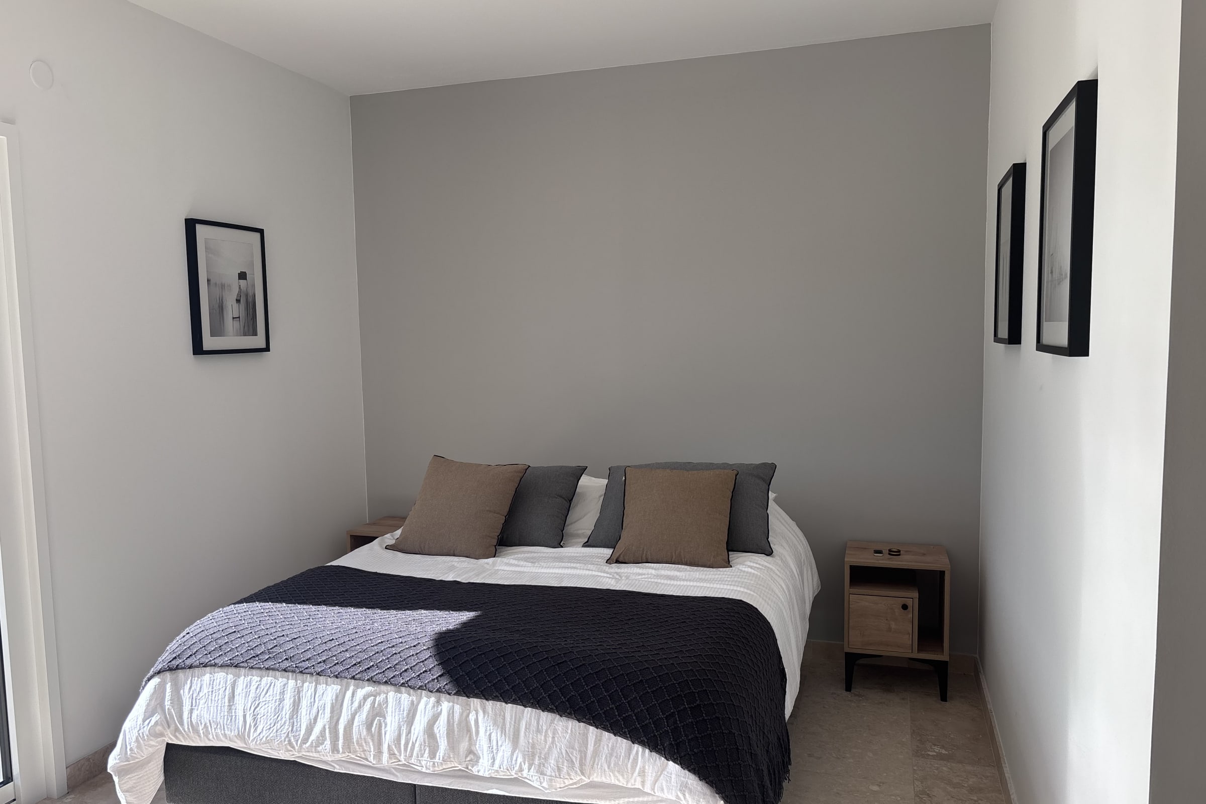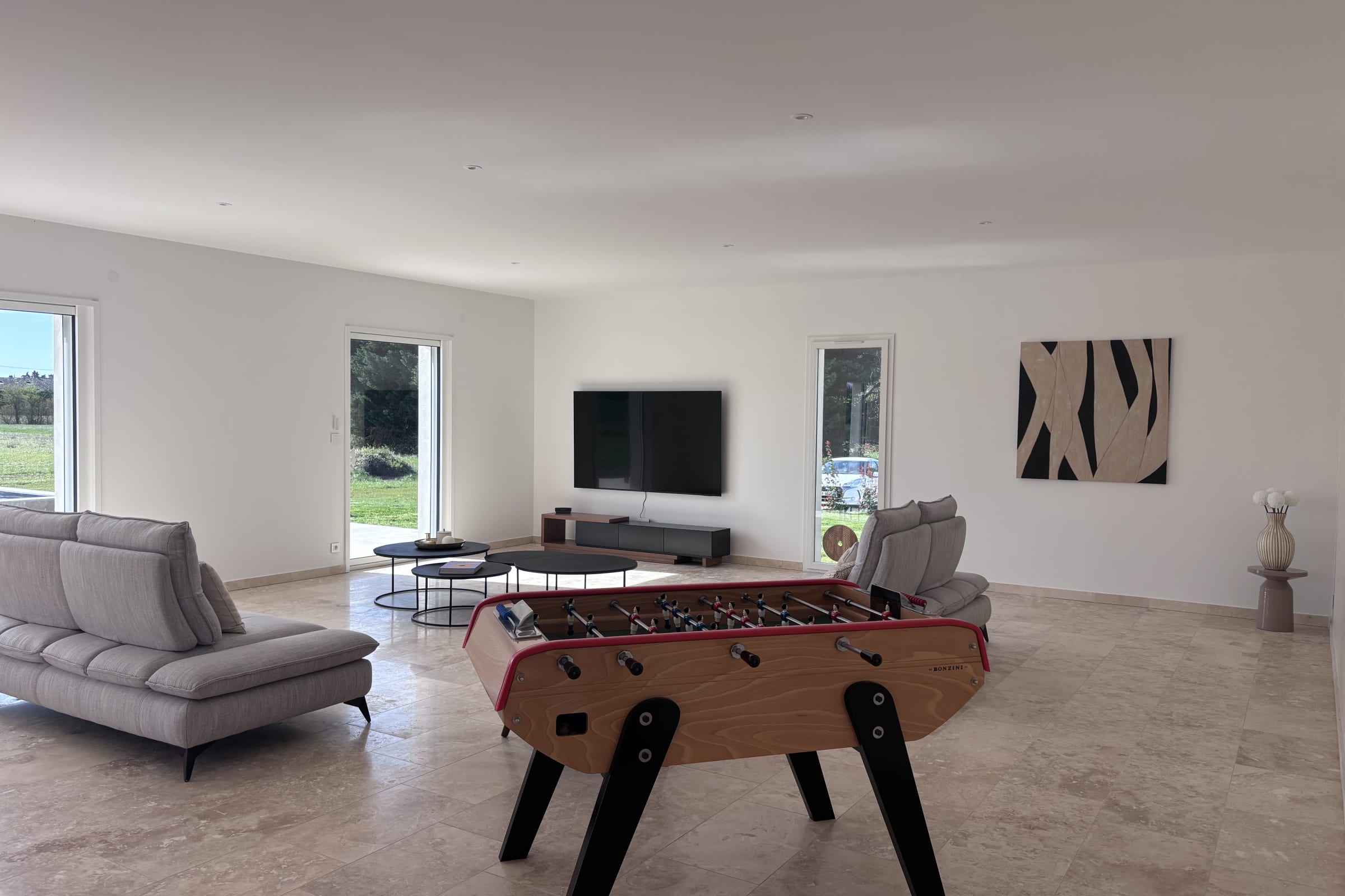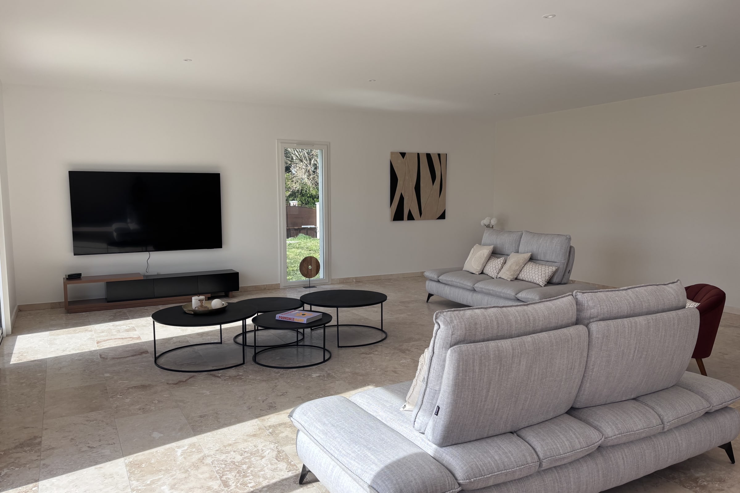 Les pièces de vie sont particulièrement spacieuses et lumineuses, avec de larges ouvertures donnant sur l’extérieur. La décoration est moderne, élégante et entièrement neuve, créant une atmosphère à la fois chaleureuse et raffinée.