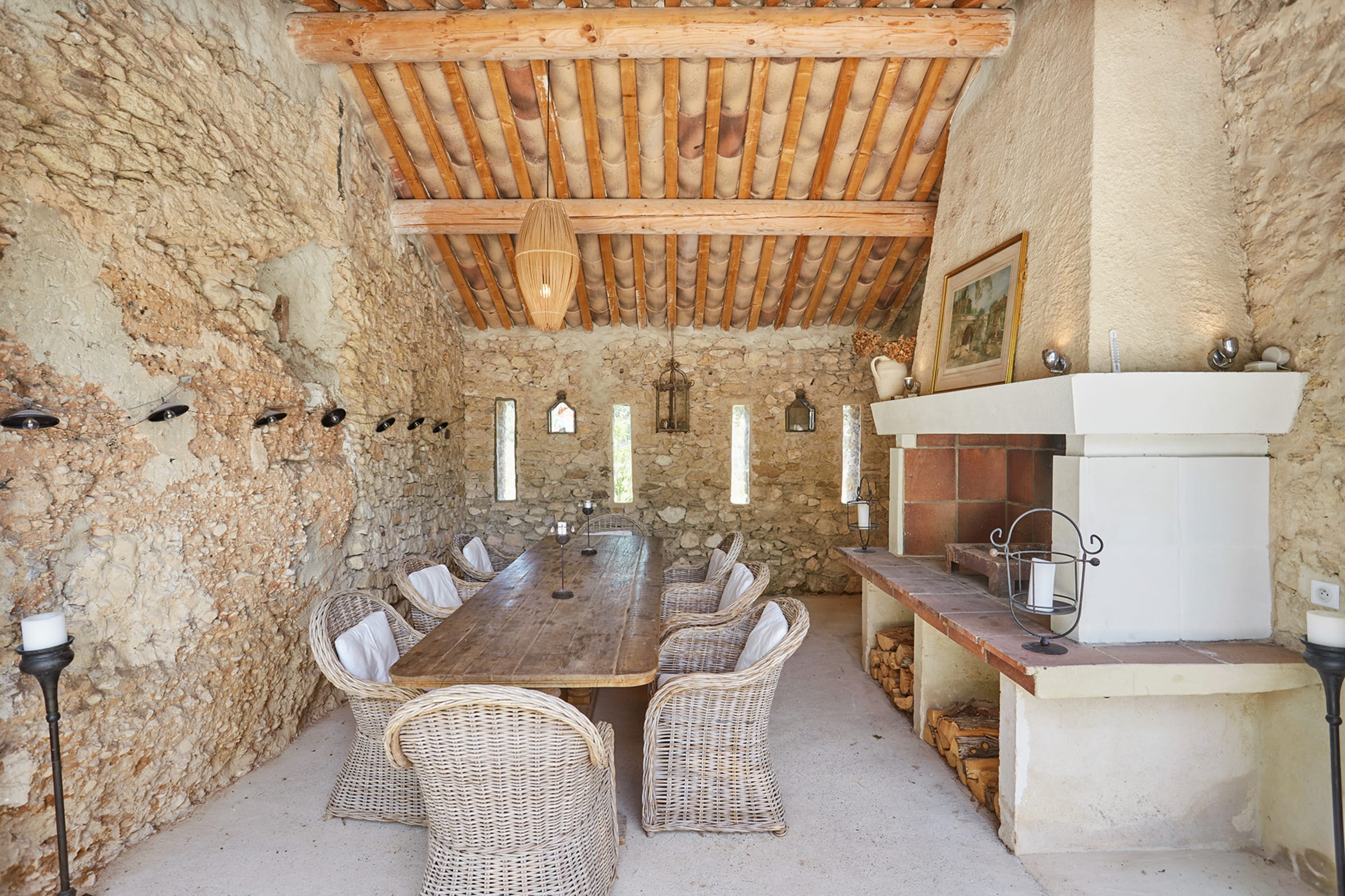 Une magnifique salle à manger d'été avec cheminée sera le lieu propice aux longs repas estivaux.