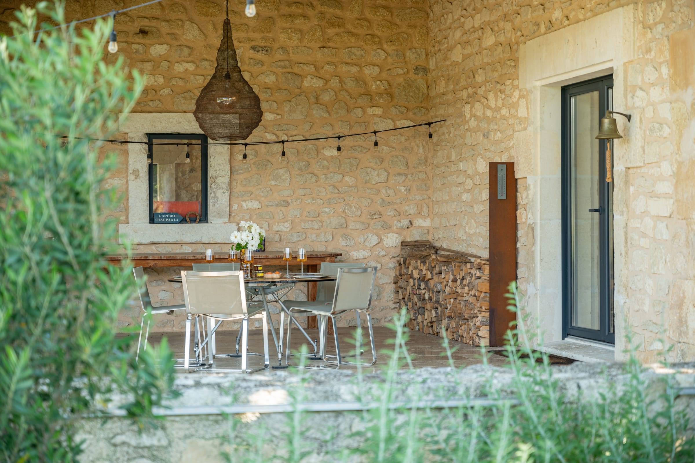 - Une grande terrasse, dont une partie est couverte, offre un espace idéal pour prendre vos repas en plein air tout en profitant de la vue sur la piscine et la campagne environnante.