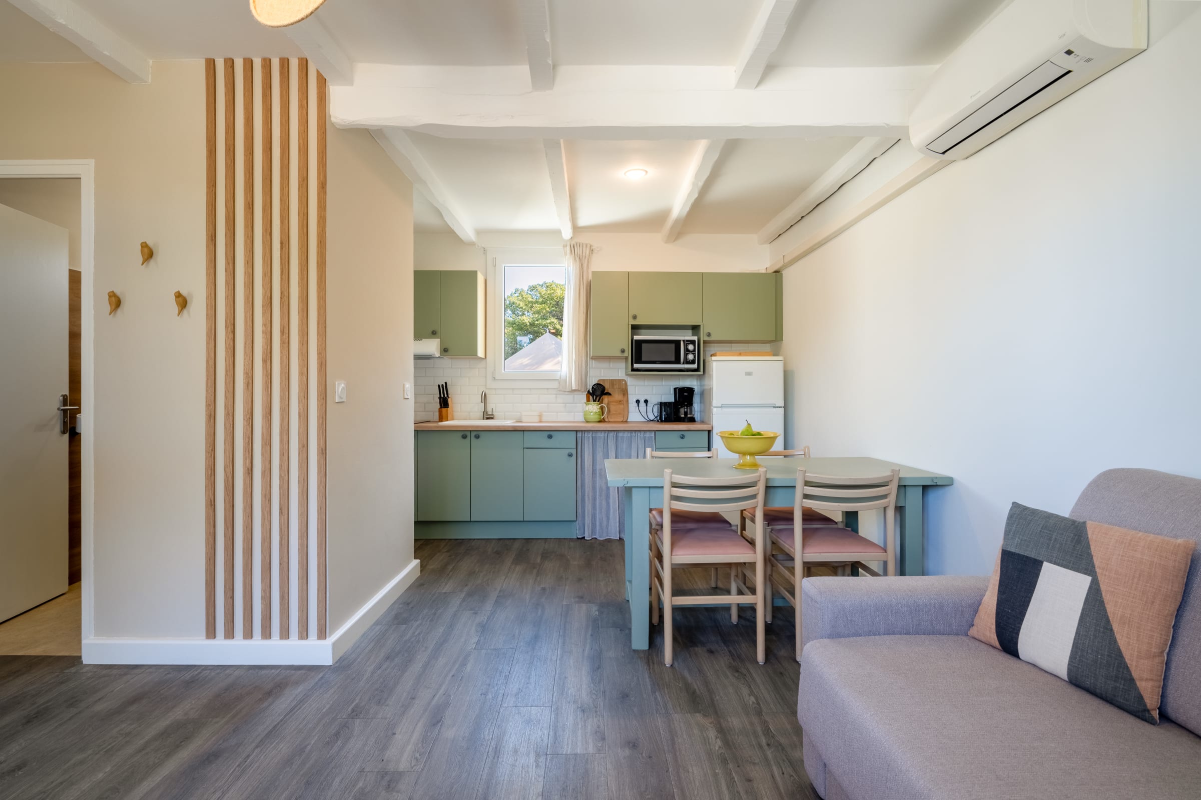 Entièrement rénovée pour votre confort, cette retraite confortable dispose d'une chambre accueillante avec un lit double de 140 cm et un lit simple. Le salon est équipé d'un canapé convertible pouvant accueillir deux personnes, permettant d'accueillir confortablement jusqu'à cinq personnes.