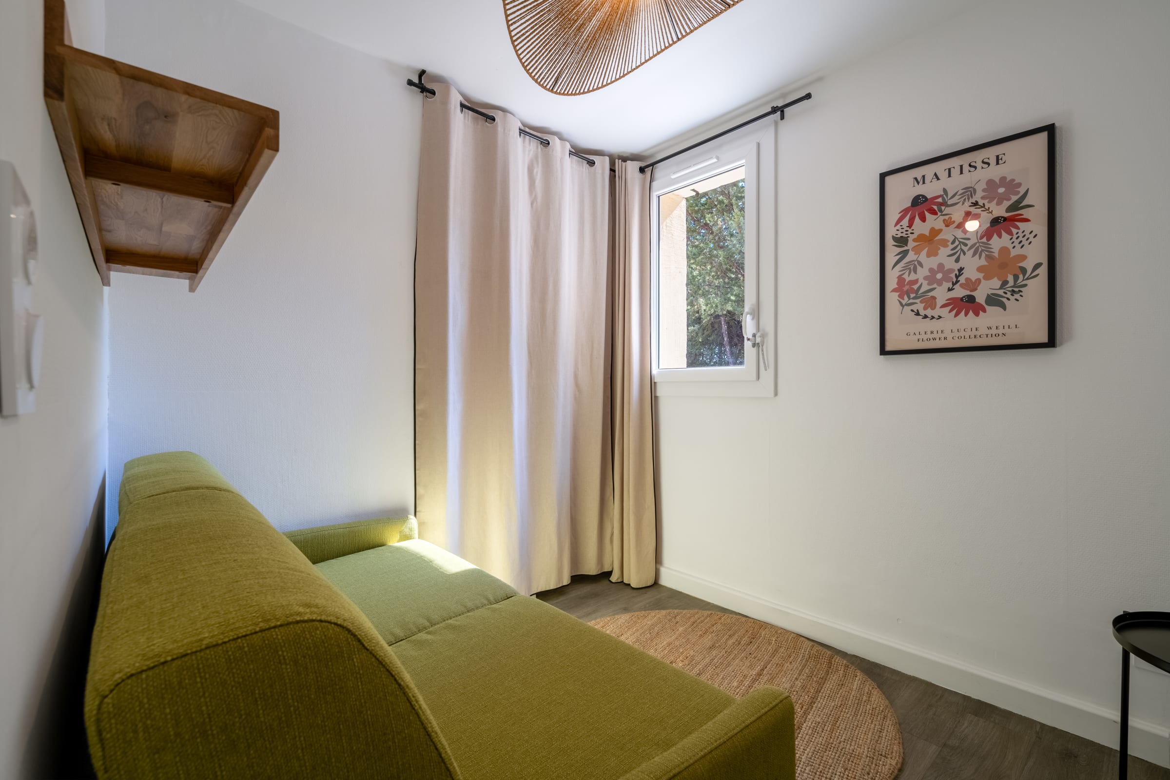Récemment rénovée, cette retraite confortable offre deux chambres confortables : l'une avec un lit double de 160 cm et un lit simple, et l'autre avec un canapé convertible pouvant accueillir confortablement deux personnes, permettant d'accueillir jusqu'à cinq personnes.