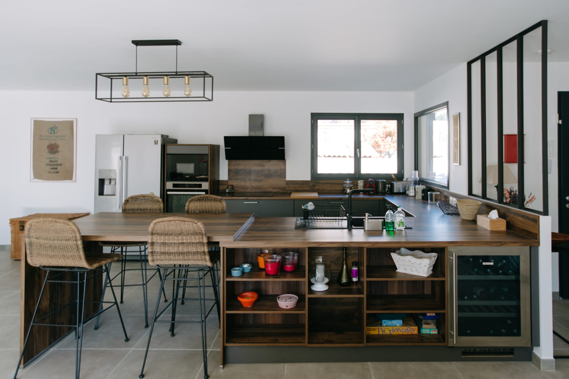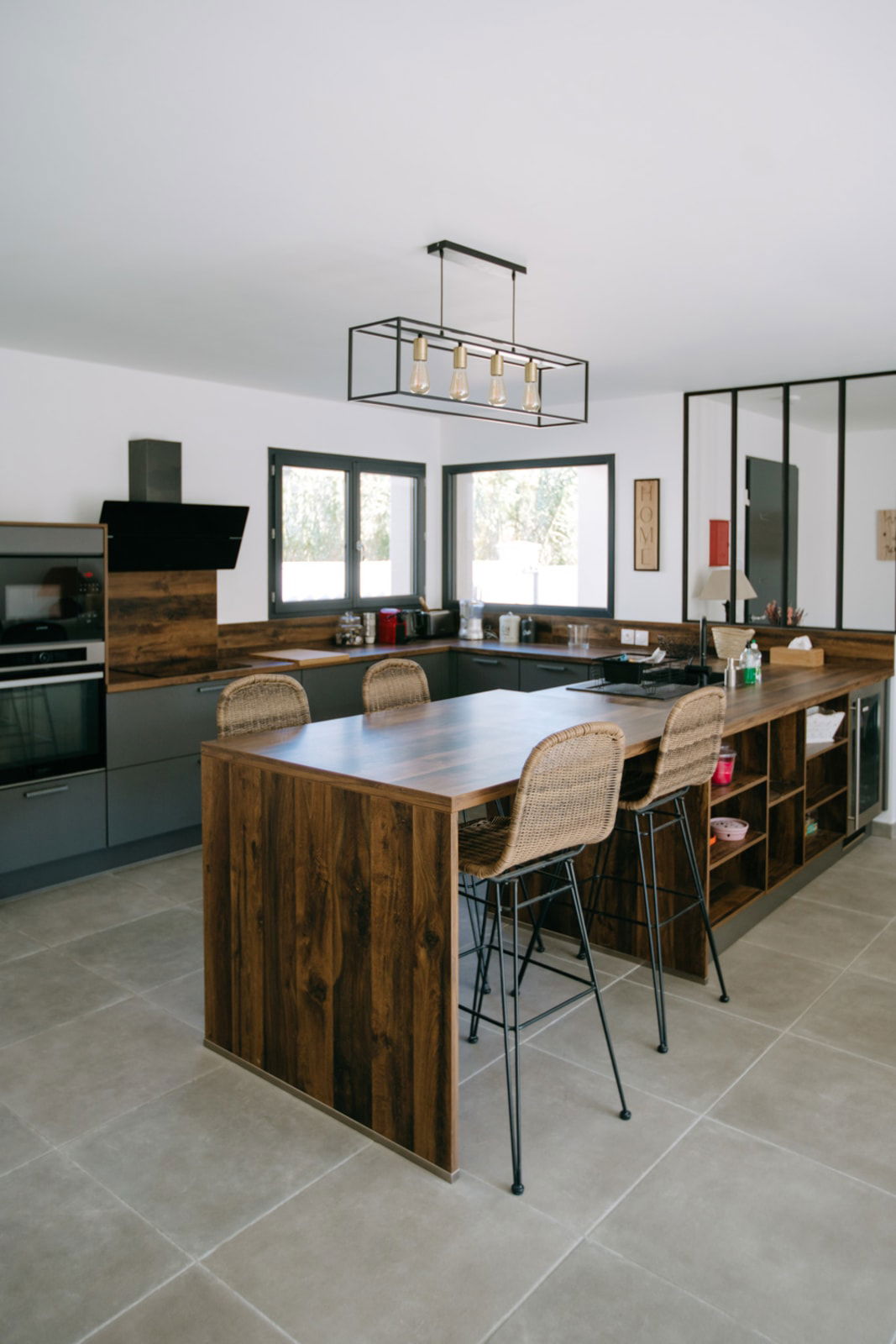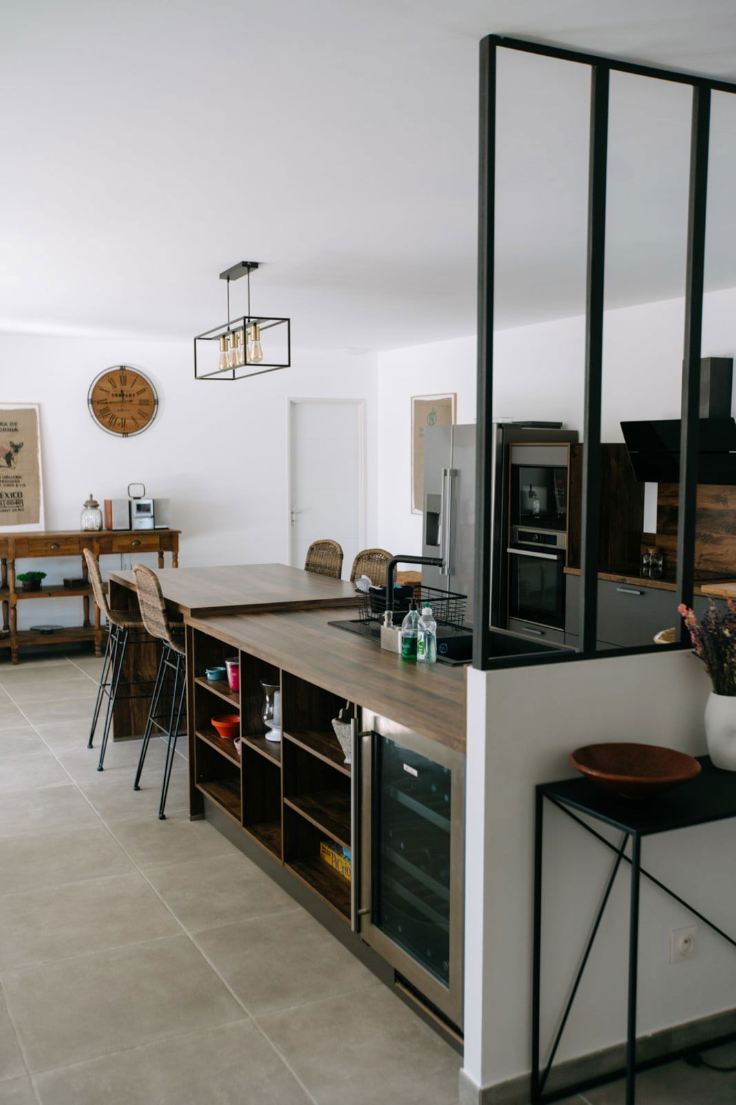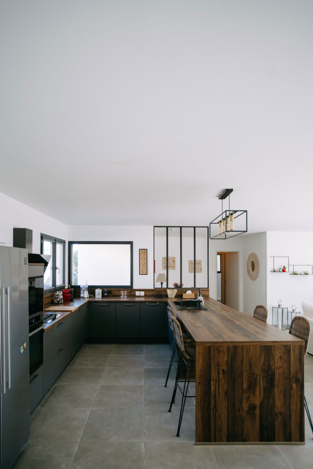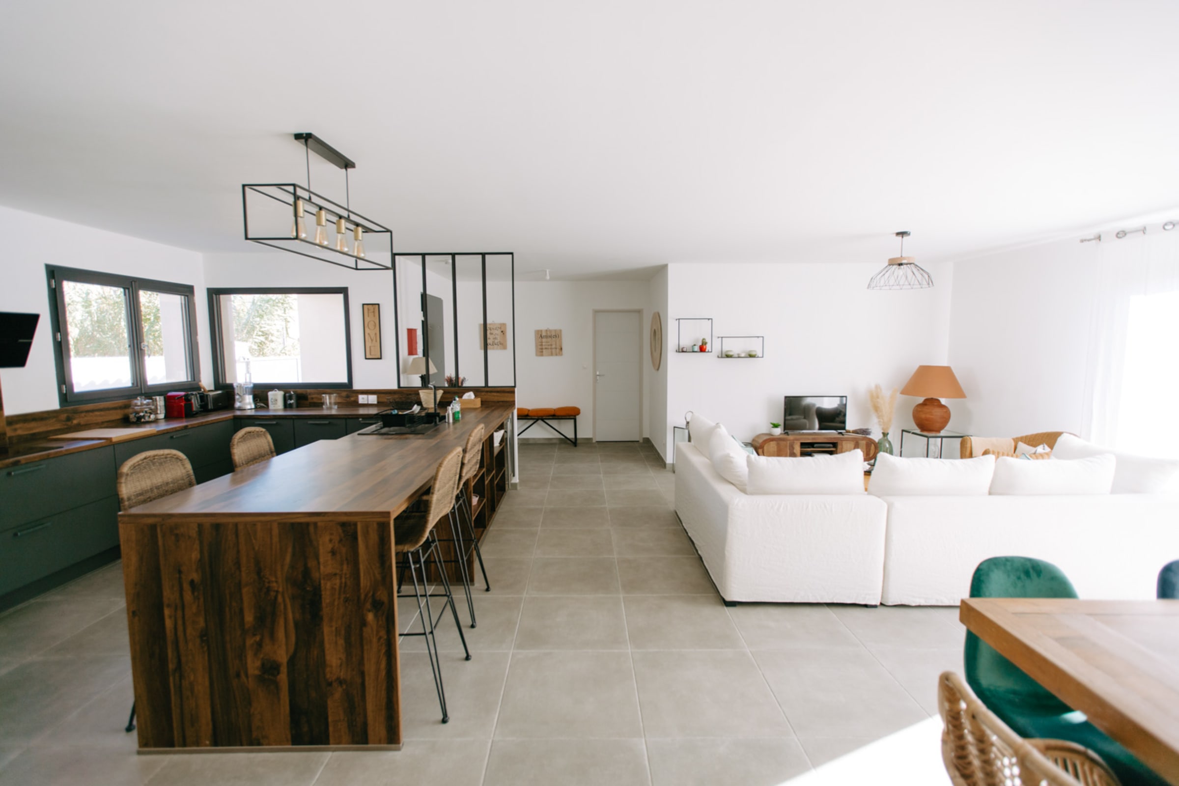 Dès l’entrée, une verrière élégante crée une transition douce vers un vaste espace de vie lumineux et convivial. La grande cuisine ouverte, entièrement équipée, s’étend sur un salon et une salle à manger spacieux — un lieu de vie idéal pour partager des moments de détente et de convivialité.