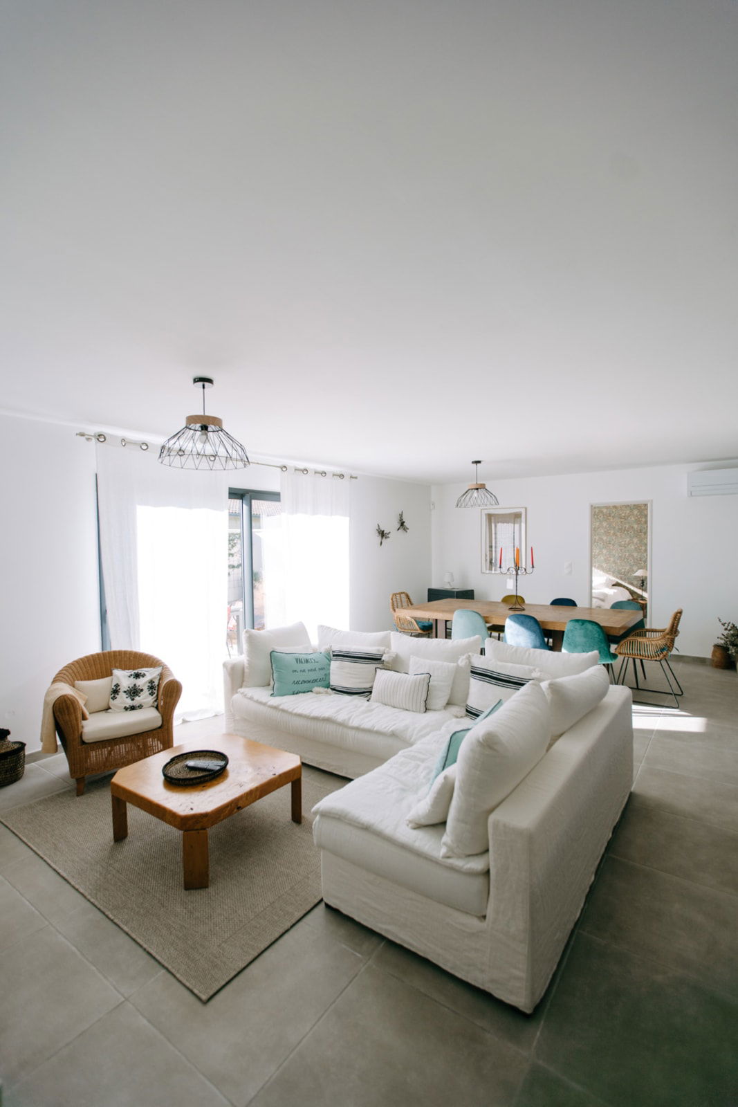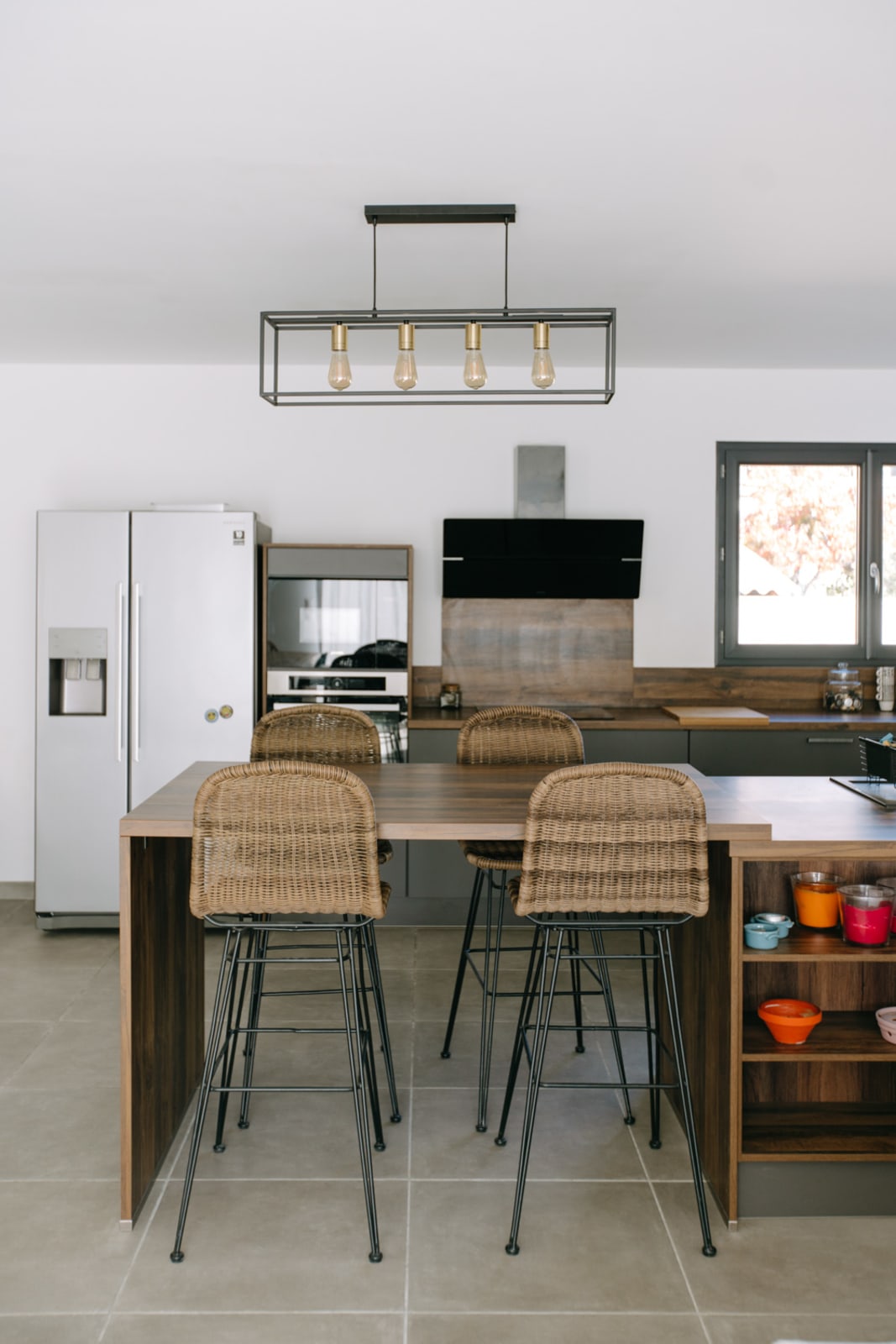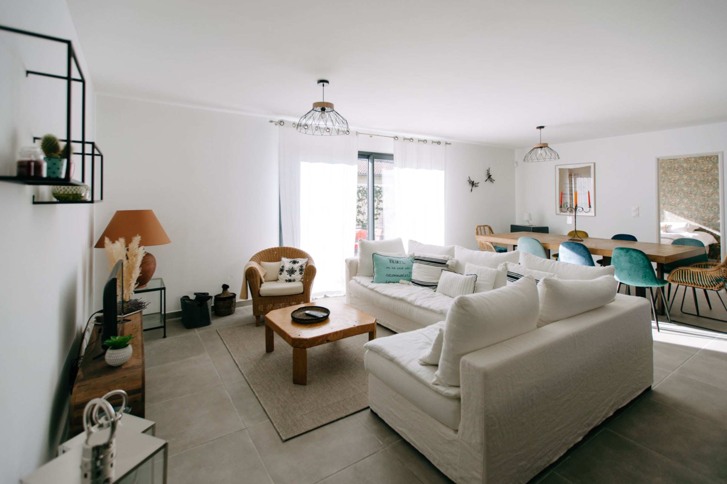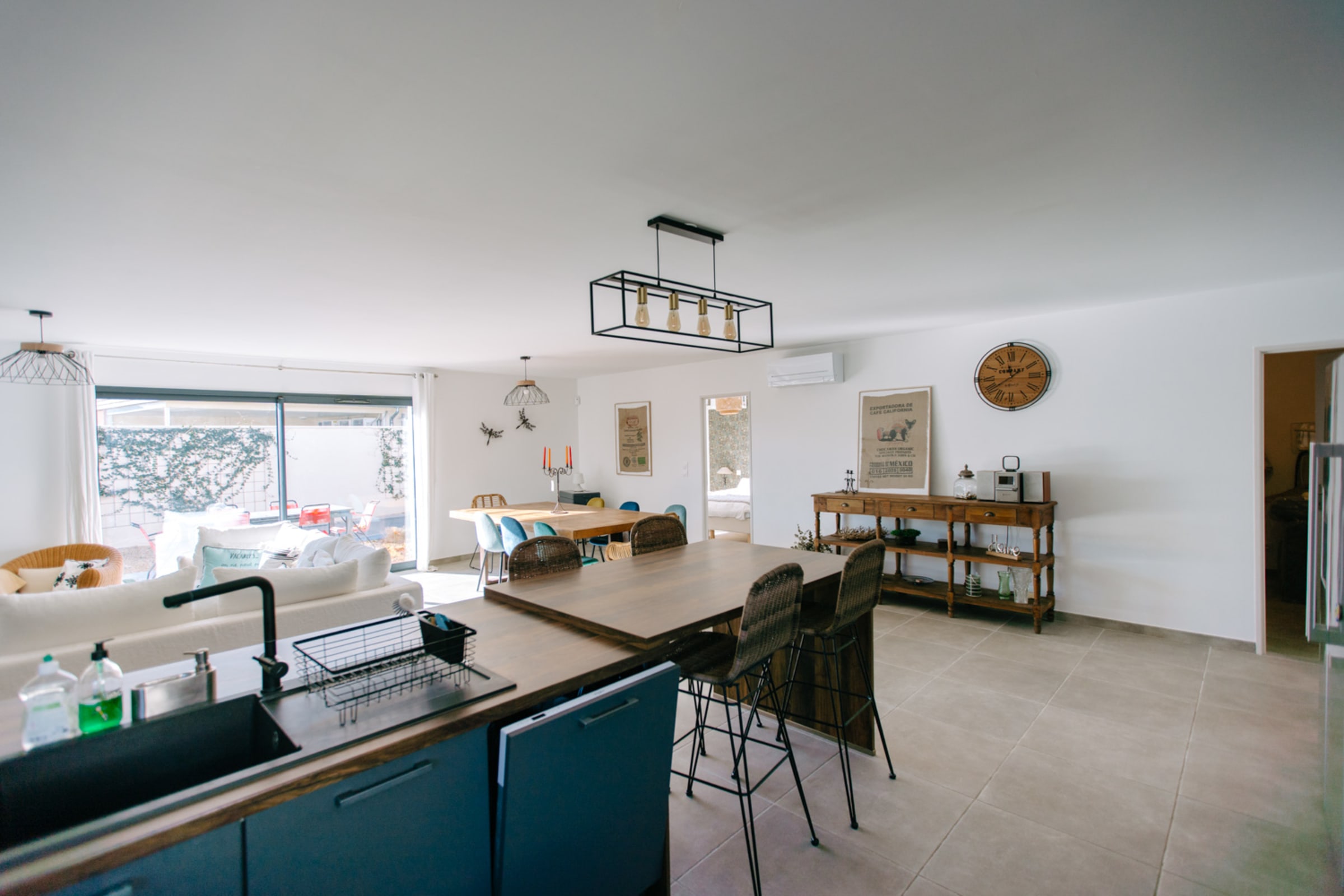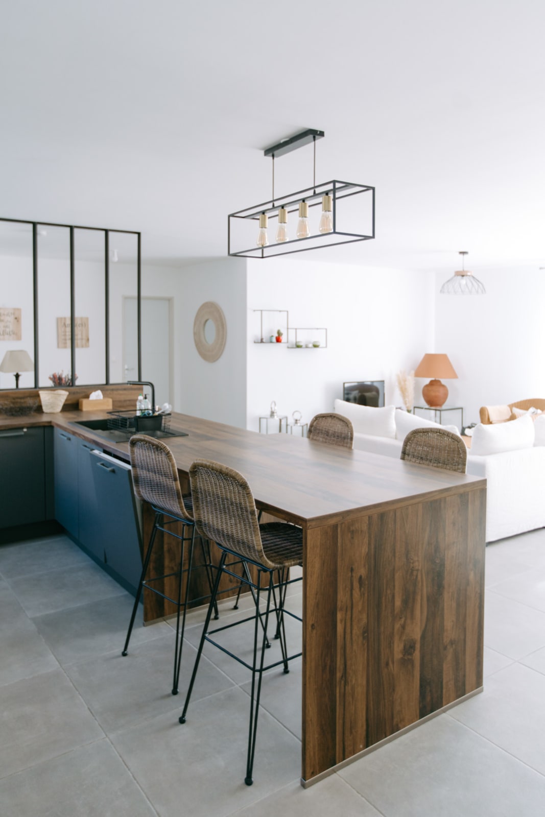 Dès l’entrée, une verrière élégante crée une transition douce vers un vaste espace de vie lumineux et convivial. La grande cuisine ouverte, entièrement équipée, s’étend sur un salon et une salle à manger spacieux — un lieu de vie idéal pour partager des moments de détente et de convivialité.