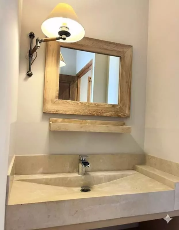 À l’intérieur, la maison entièrement climatisée offre une ambiance chaleureuse et contemporaine.