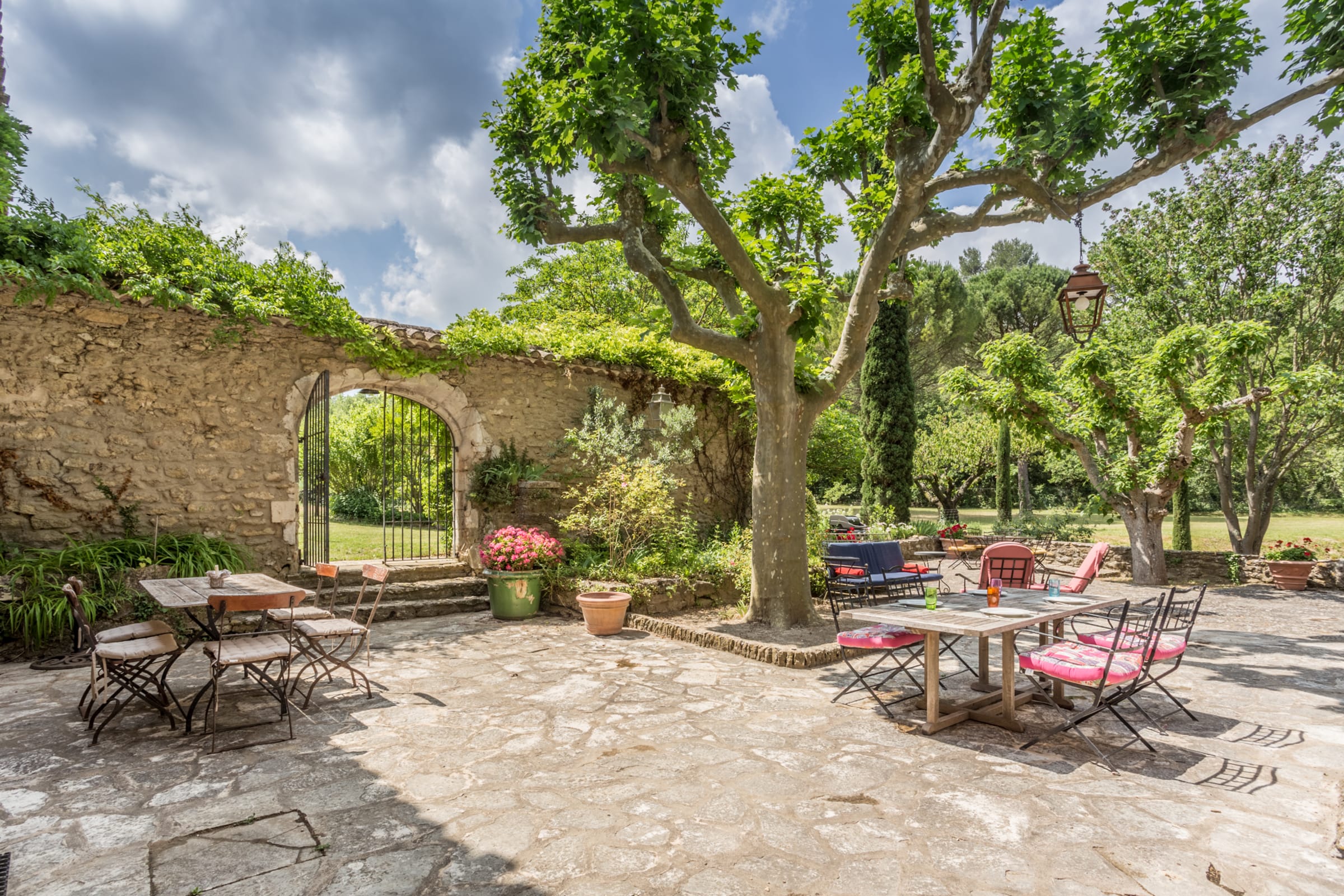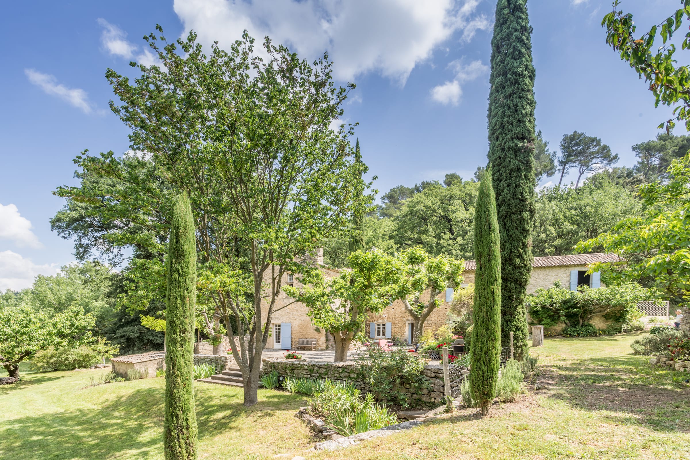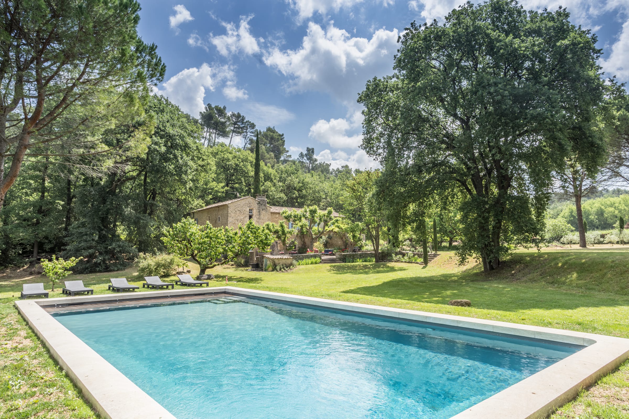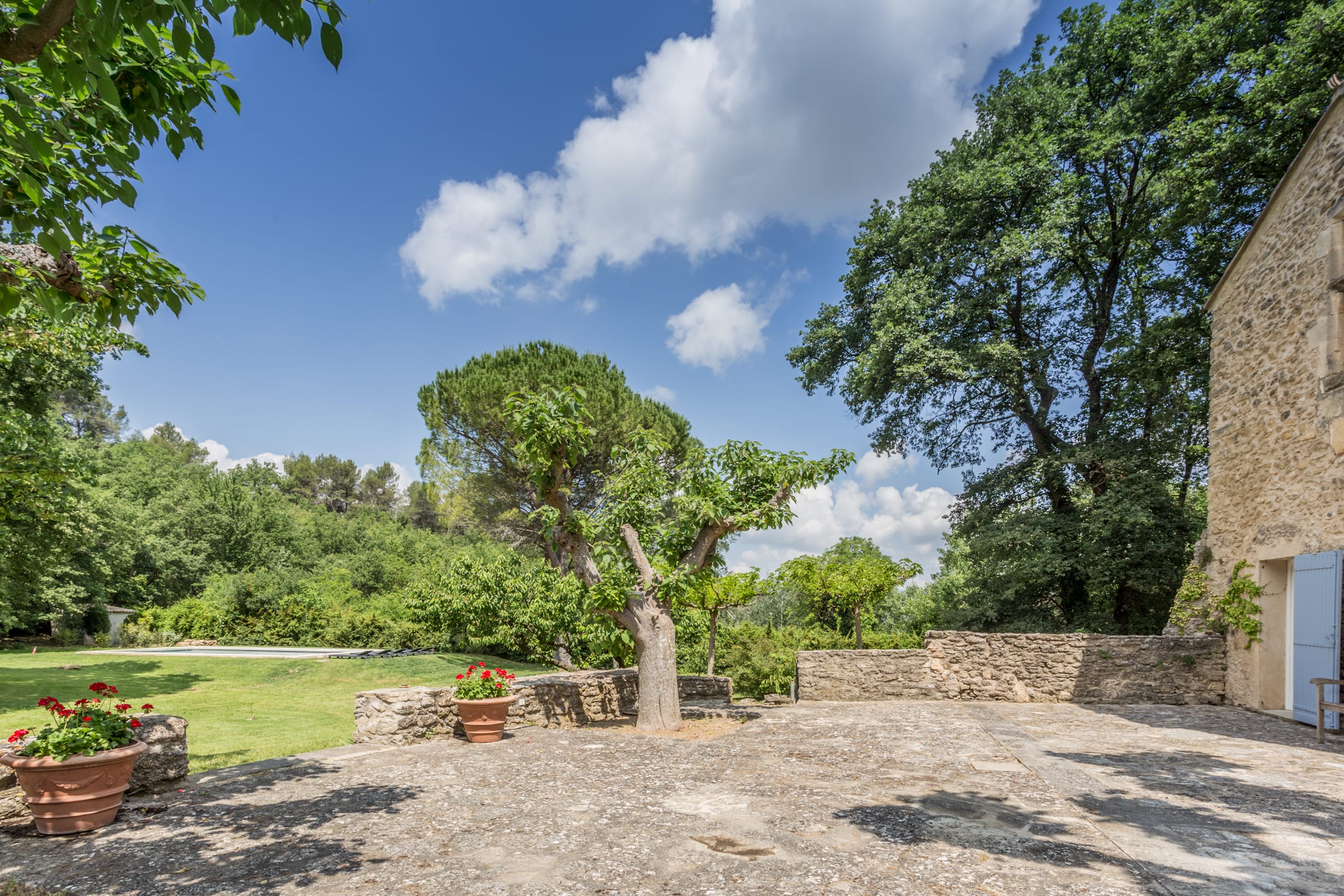Vous apprécierez une magnifique cour, à l'ombre des platanes, avec vue sur la piscine sécurisée, le jardin aux cerisiers et la vallée.