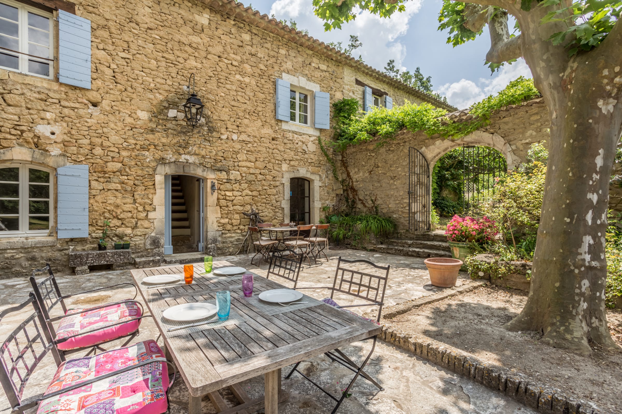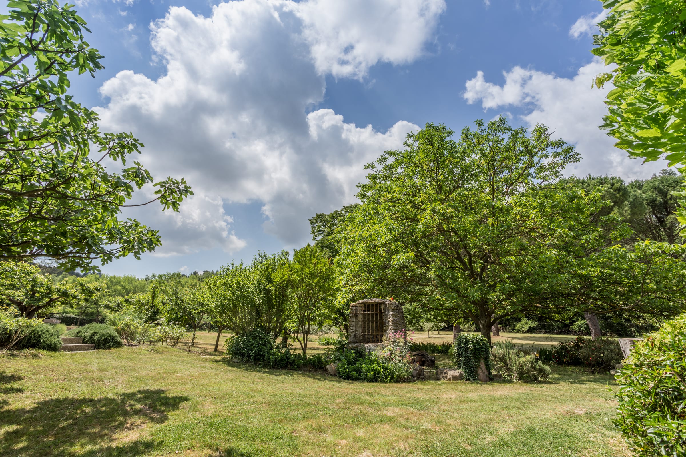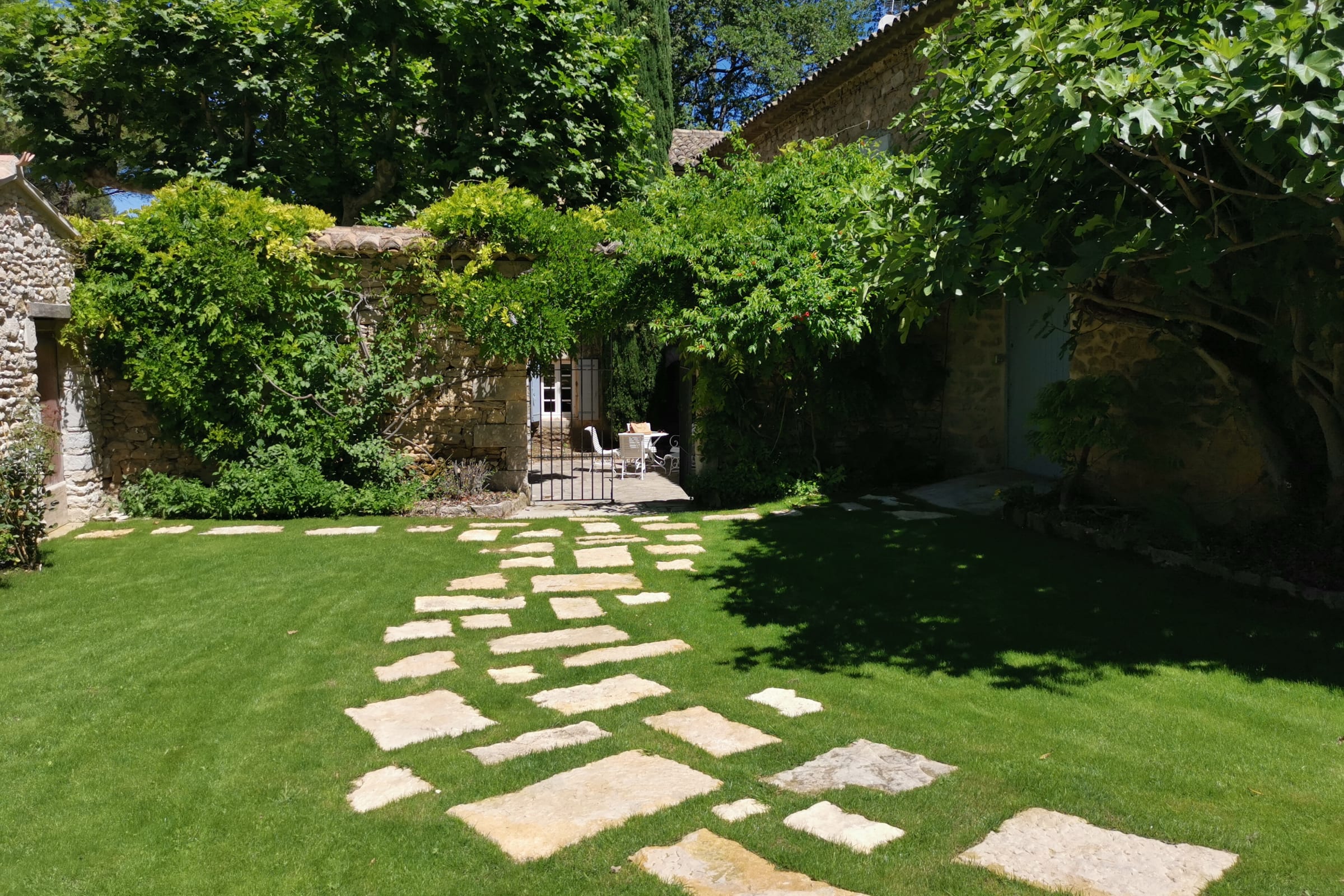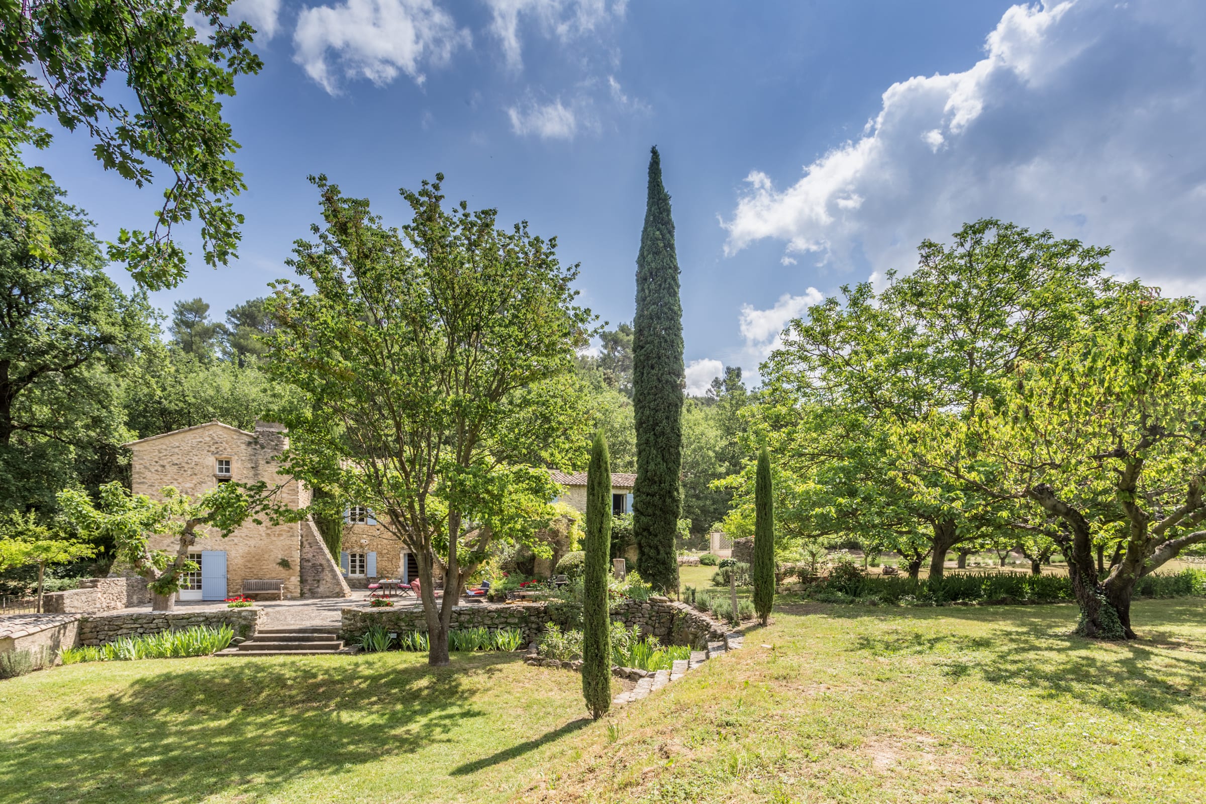 Vous apprécierez une magnifique cour, à l'ombre des platanes, avec vue sur la piscine sécurisée, le jardin aux cerisiers et la vallée.