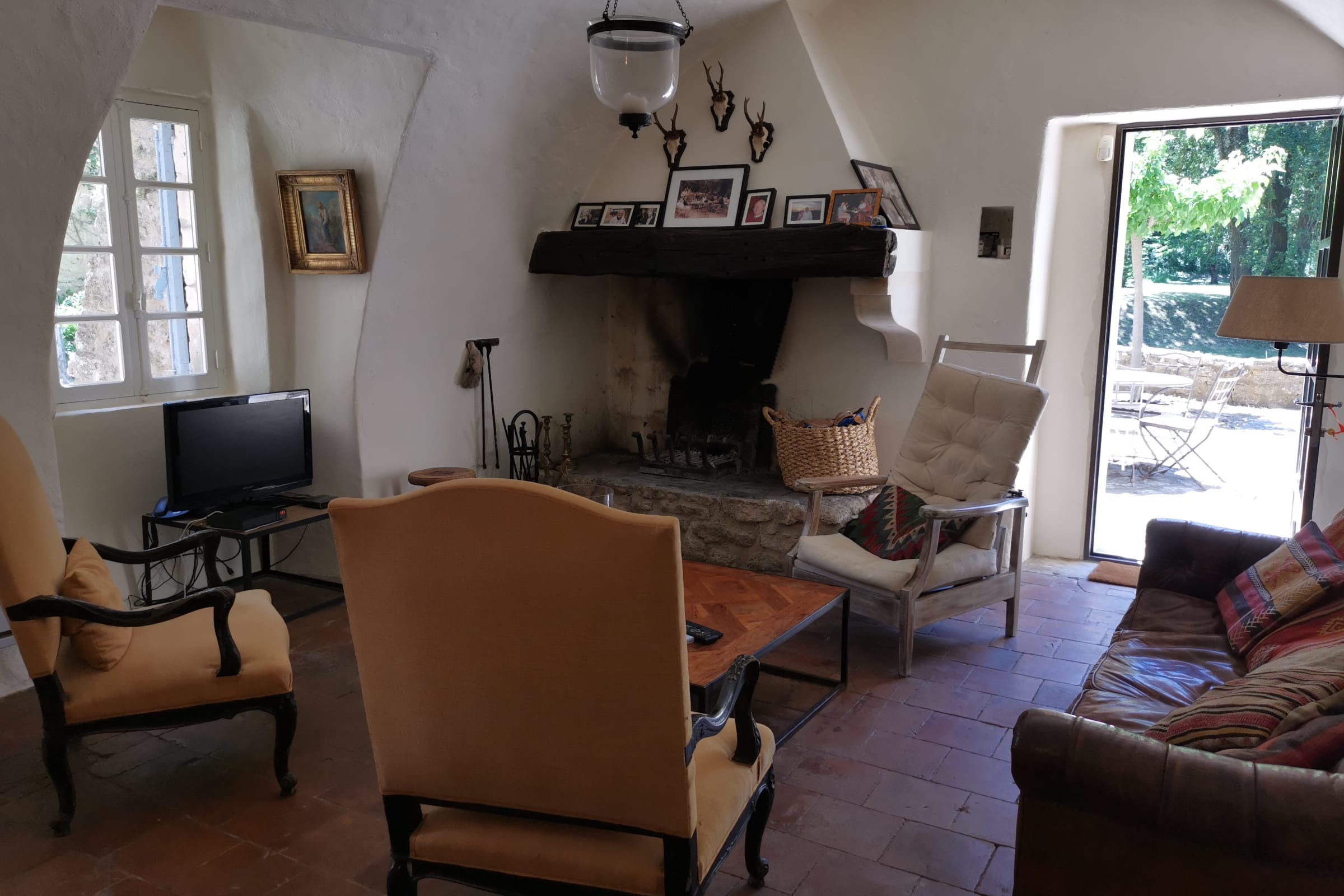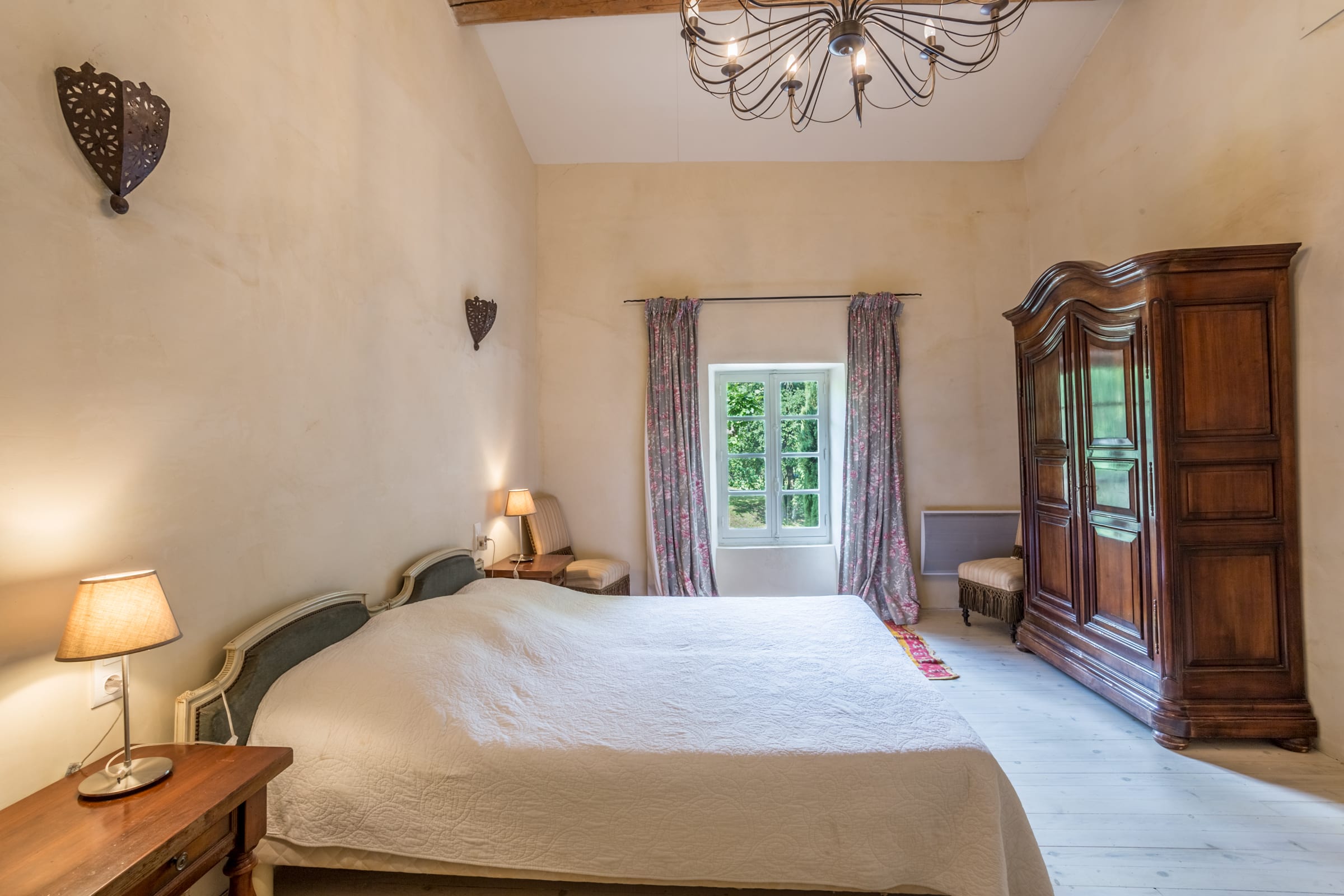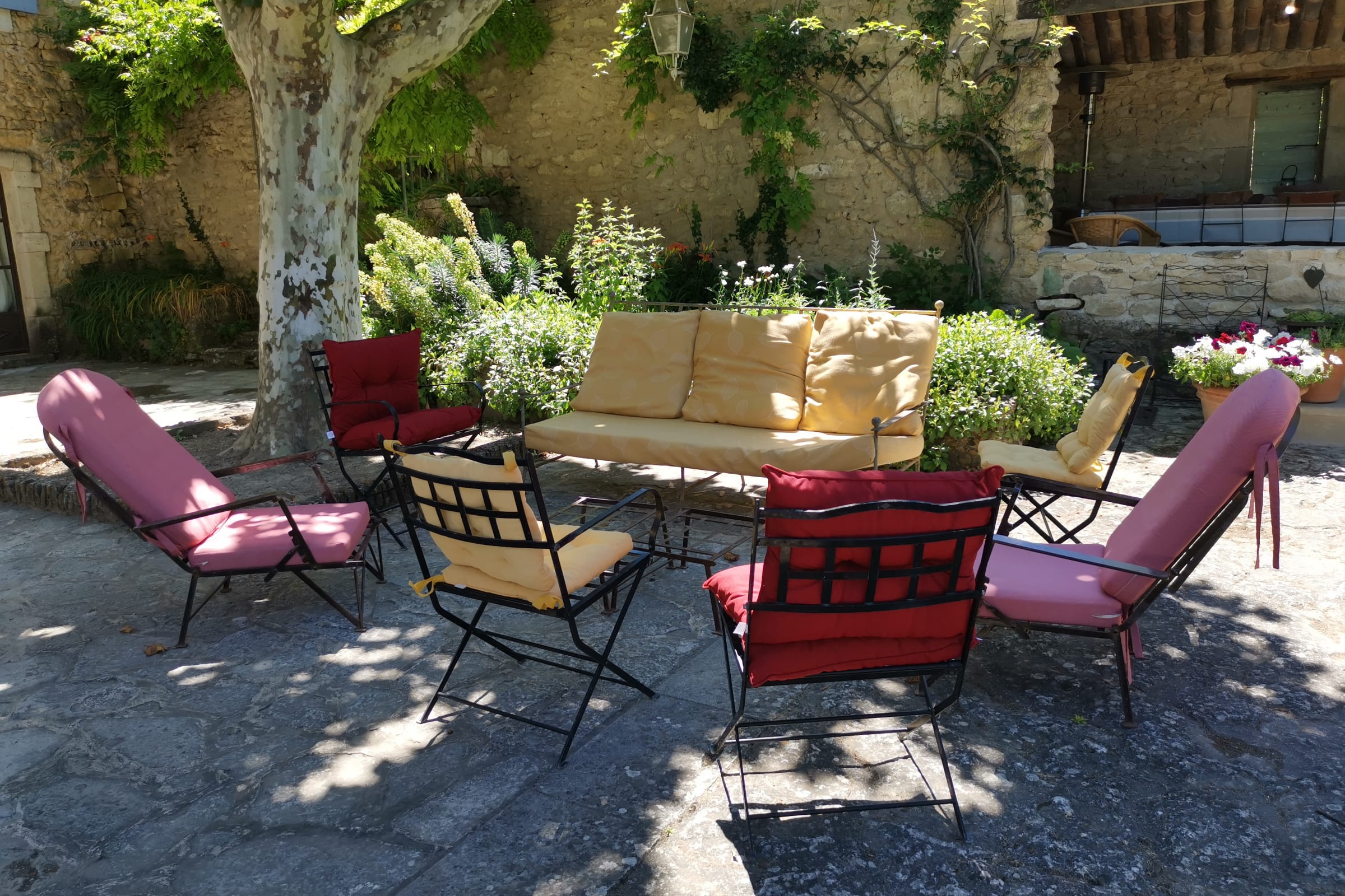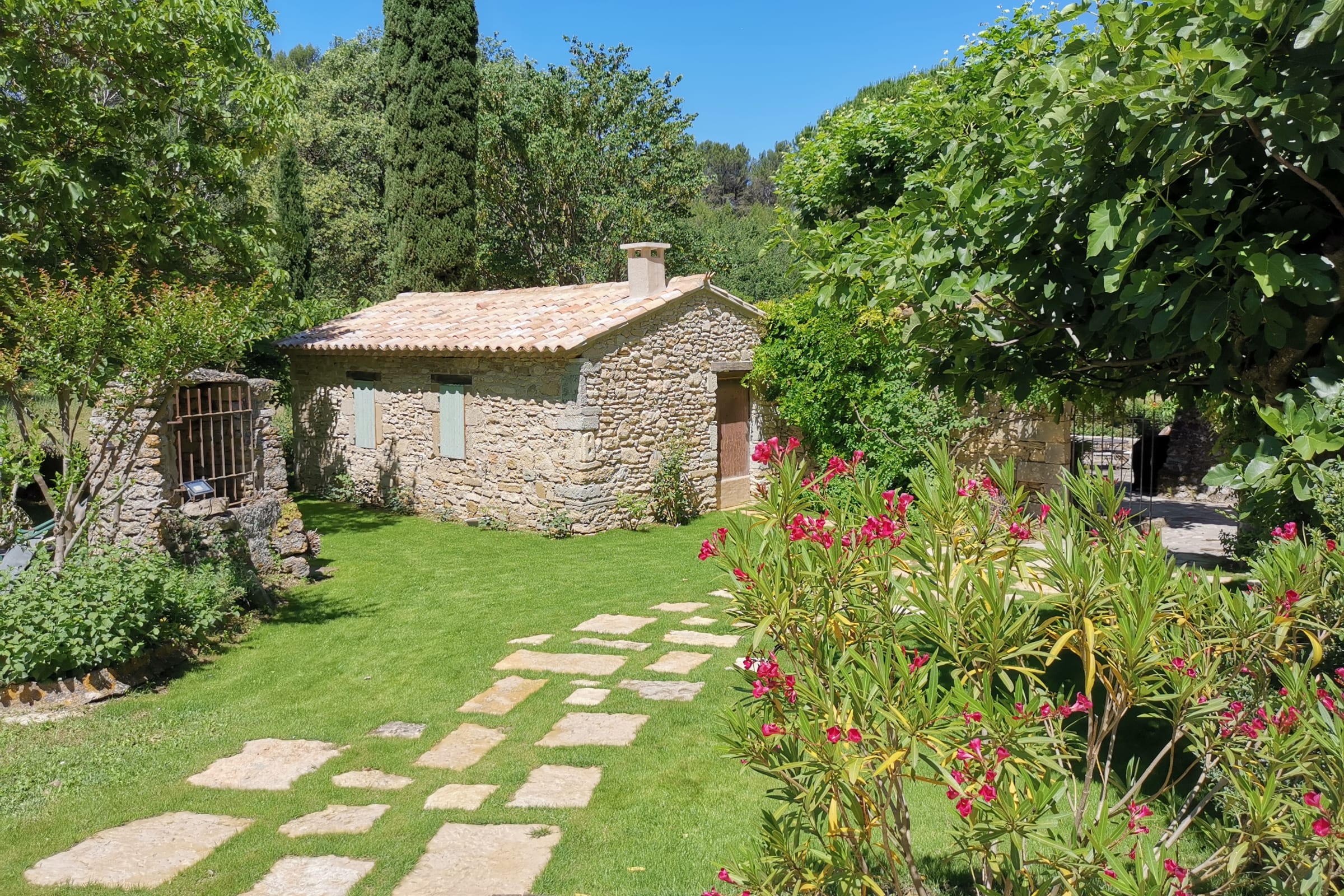 Vous apprécierez une magnifique cour, à l'ombre des platanes, avec vue sur la piscine sécurisée, le jardin aux cerisiers et la vallée.