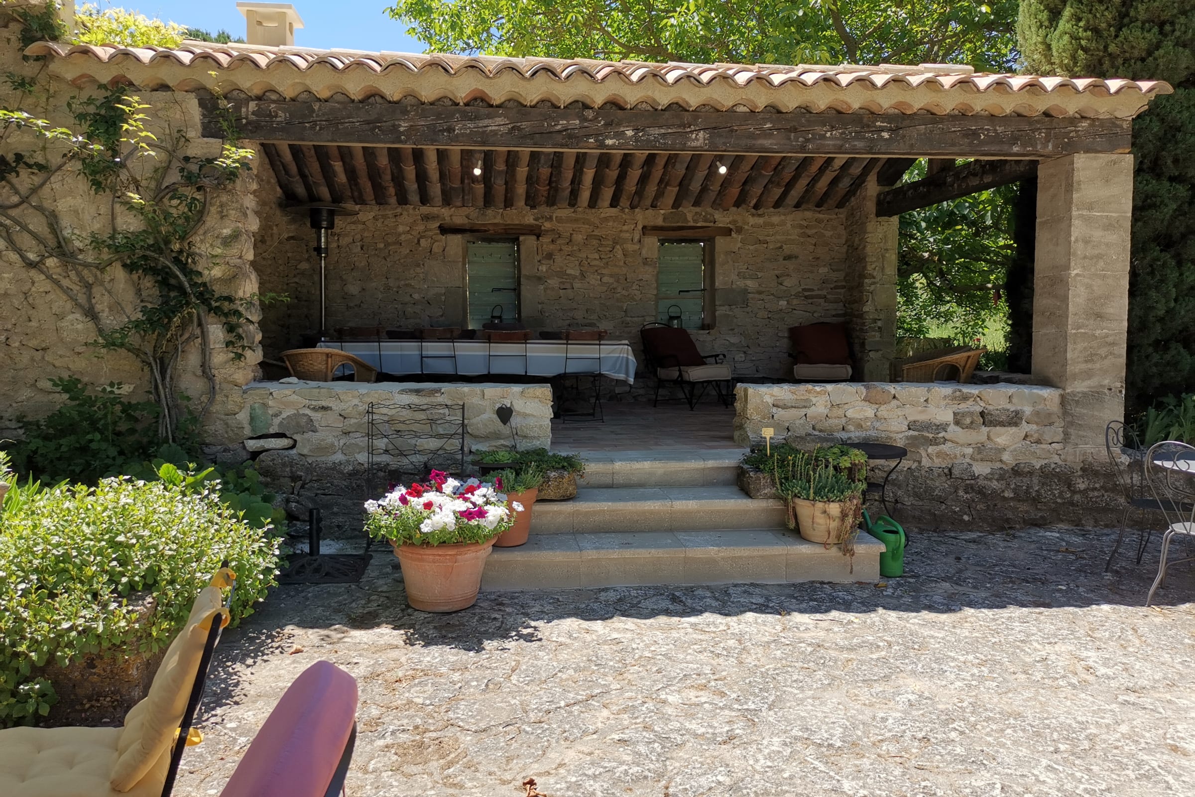 Un grand préau abrite le mobilier de terrasse ainsi qu'un barbecue pour vos repas en plein air.